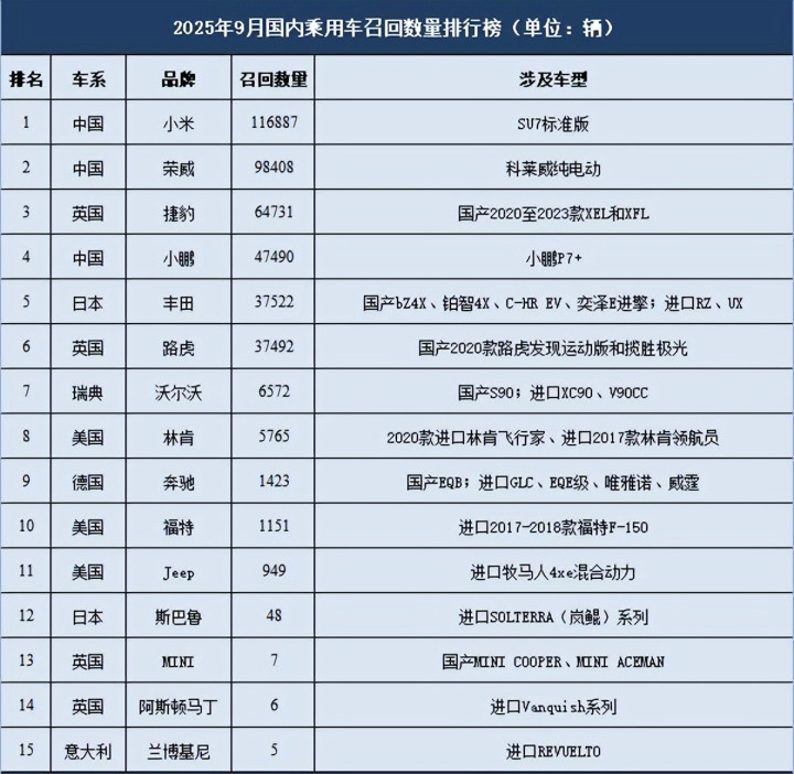 近日,国家市场监督管理总局发布了国内乘用车召回公告,2025年9月,国内汽车召回市场呈现出较为活跃的态势,共发布乘用车召回公告26则,涉及召回乘用车总量达418456辆。不过,与2025年8月份相比,召回数量减少了16.18%,这一变化或许与当月汽车生产、质量检测等多方面因素有关。